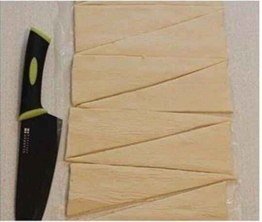 Для начала припудрите стол мукой, чтобы тесто не прилипало. Затем, разложите лист слоеного теста и разрежьте его на длинные треугольники.