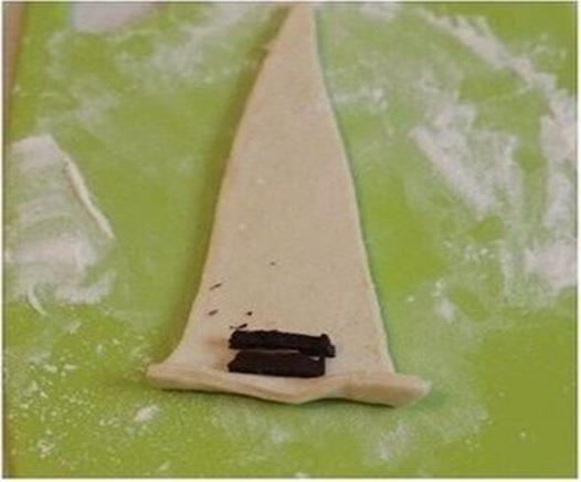 Получившиеся треугольнички сверните рулетиками (начинайте сворачивать с широкой стороны). А ещё можно на основание треугольника положить начинку. Начинка должна быть не жидкой - она будет вытекать в процессе приготовления. Лучше всего подходит шоколад.