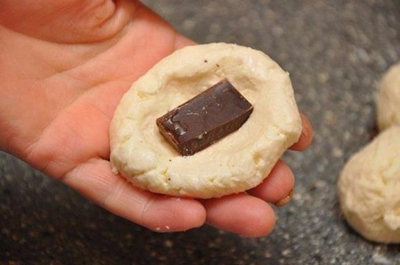 Из каждого шарика сформировать лепешку (лучше это делать на ладони), положить кусочек шоколада, защипать края и сформировать сырник. Аналогично поступить с остальной творожной массой.