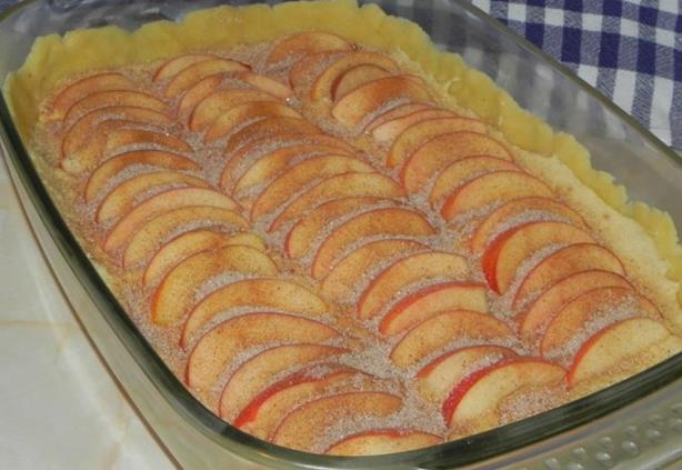 Слегка вдавить дольки яблок и посыпать сверху сахаром, предварительно смешанным с корицей.