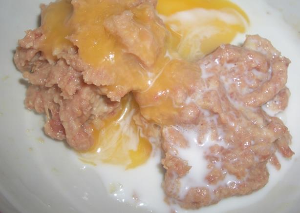 В полученный фарш добавить 1/2 желтка, соль и молоко от хлеба (что бы не сильно жидкий фарш получился!), перемешать.
