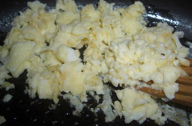 взбить яйцо в легкую пену и обжарить на раскаленной сковороде с небольшим количеством растительного масла. Постоянно помешивая вилкой, создавая рыхлую структуру.