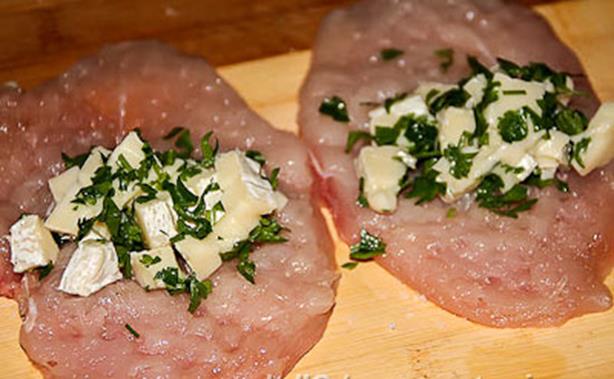 Сыр и петрушку измельчить. Отбитые пласты мяса посолить, разложить на них начинку.