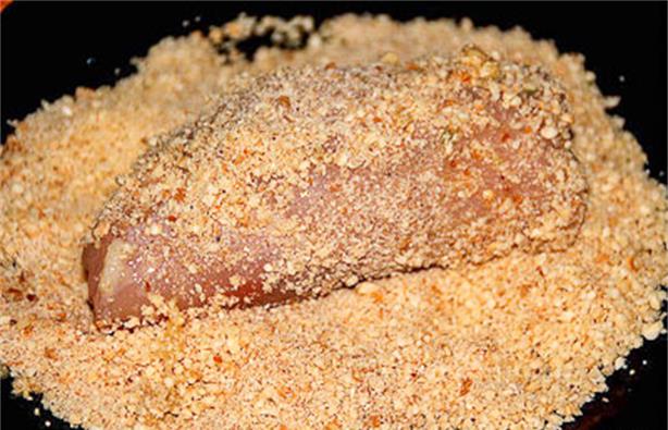 Обмакнуть во взбитое яйцо и обвалять в миндально-сухарной смеси.