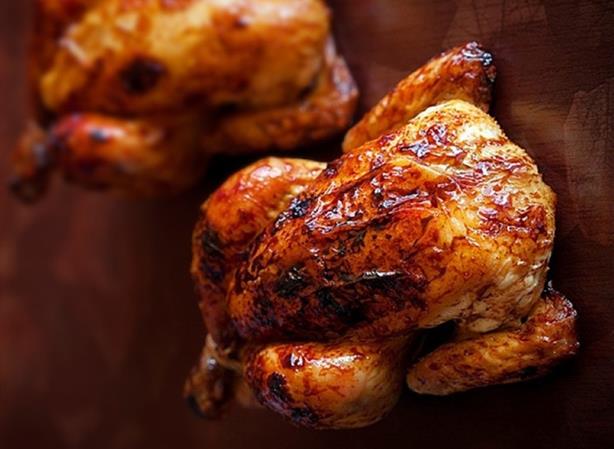 Вернуть противень с курицей в духовку и запекать еще около часа, периодически поливая курицу соком из противня; чем чаще это делать, тем быстрее образуется корочка — и тем сочнее будет под ней мясо.