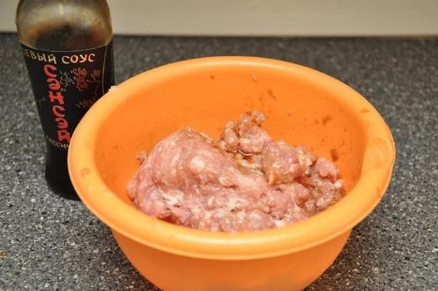 Лук натираем на терке (можно пропустить через мясорубку) и кладем в фарш. Добавляем соевый соус, перец, измельченный чеснок. При необходимости солим, но не забываем, что соевый соус сам по себе достаточно соленый. Фарш хорошо перемешиваем и убираем на 30 минут в холодильник.