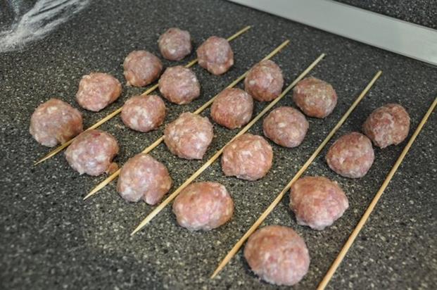 Затем формируем фрикадельки – по 4 штуки на шпажку. Таким образом, одна фрикаделька получается весом 25 г, а порция на шпажке – 100 г.
