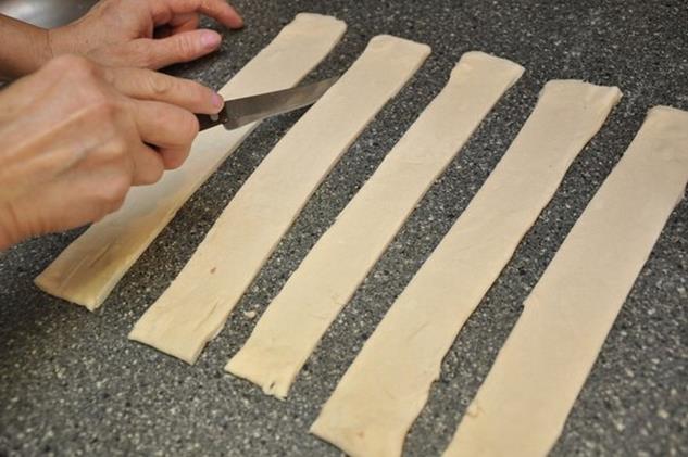 Тесто раскатываем в прямоугольник и нарезаем полосками шириной чуть больше диаметра фрикаделек.