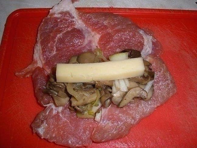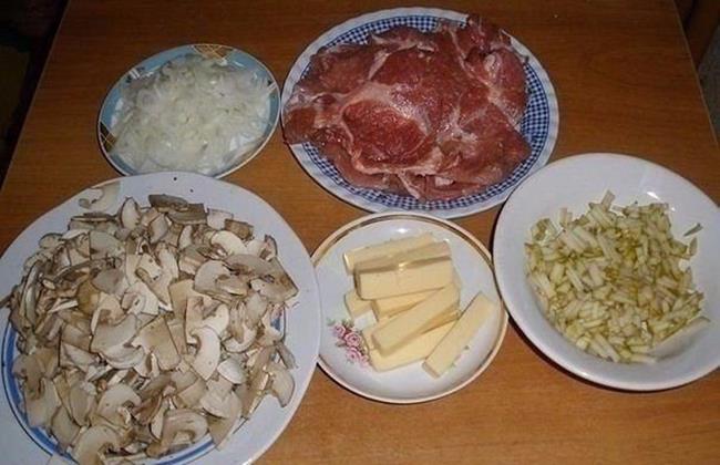Мясо нарезаем на продолговатые ломтики, отбиваем, солим, перчим. Лук нарезаем полукольцами, грибы - пластинами, грушу - небольшими кусочками. Сыр нарезаем полосочками толщиной 0,5*0,5 см.