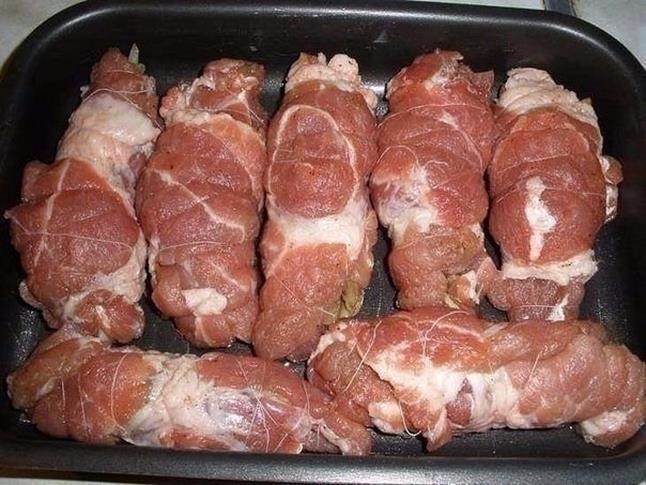 На кусочек мяса выкладываем немного начинки, ломтик сыра и сворачиваем в рулетик, перематываем ниткой или можно сколоть зубочистками.