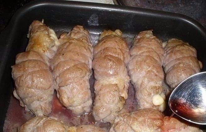 Ставим в разогретую духовку до 180 С на 10 минут. Далее каждый рулетик обливаем вином и опять отправляем в духовку до полной готовности примерно на 10-15 минут.