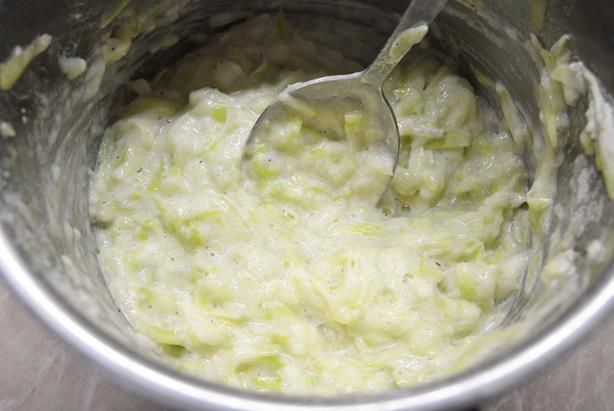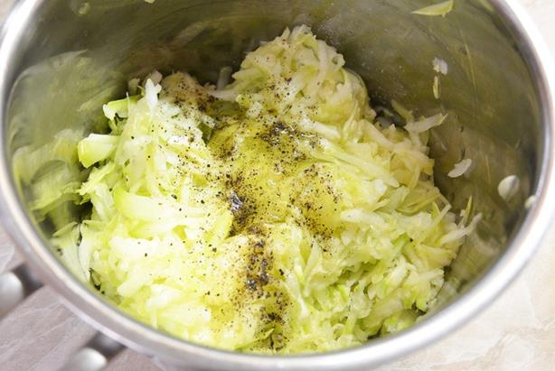Кабачки натереть на крупной терке. Посолить. Оставить на 5 минут. Отжать сок. Добавить яйцо, перец и перемешать.