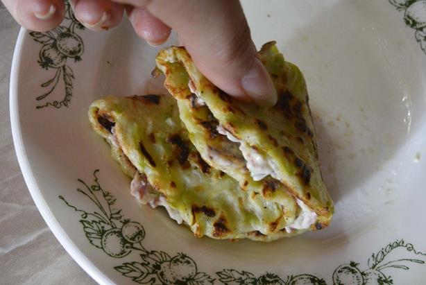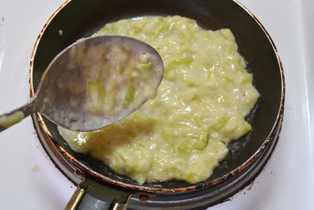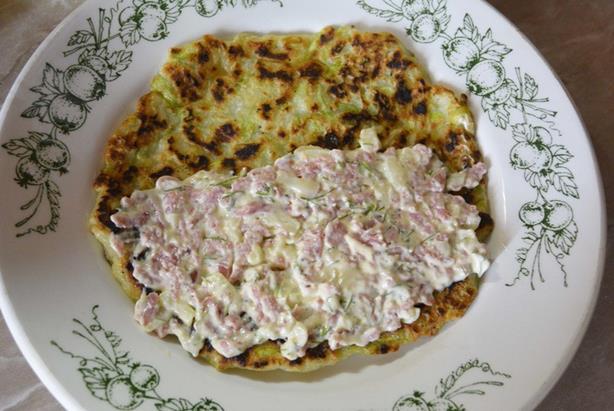 Пожарить кабачковые блины на маленькой сковородке. У меня 13см. Блины складывать один на один.