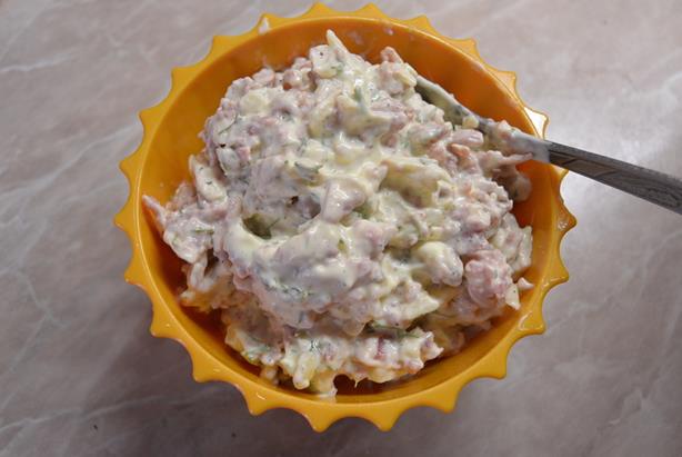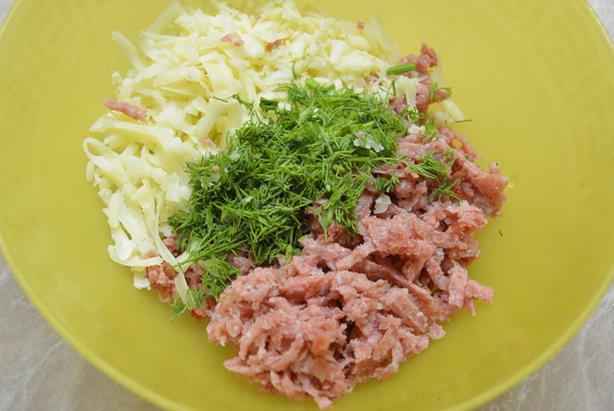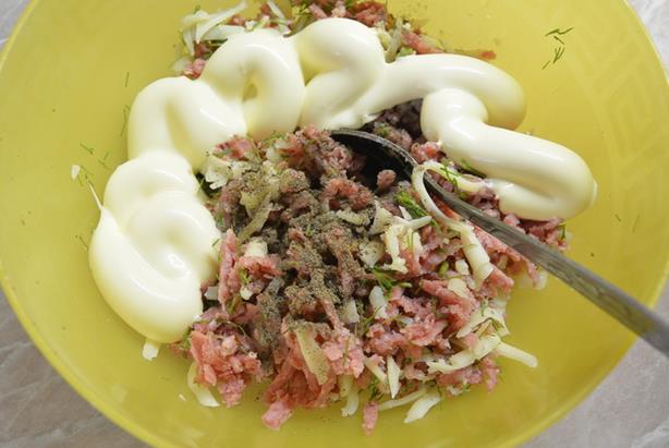 Колбасу и сыр натереть на мелкой терке. Добавить рубленный укроп.