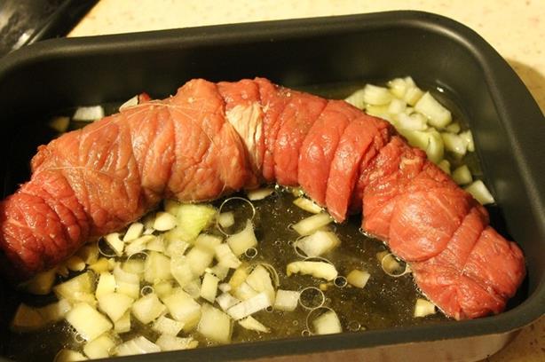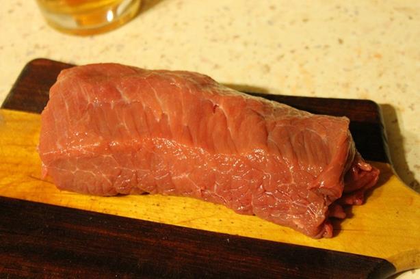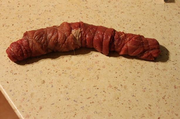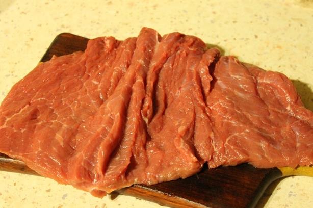 Говядину разрезать по длинной стороне, по спирали в пласт. Слегка отбить с одной стороны. Посолить и поперчить по вкусу.
