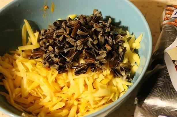 Рис отварить согласно инструкции на упаковке. Сыр натереть на крупной терке. Смешать сыр и рис, добавить куркуму и перемешать.