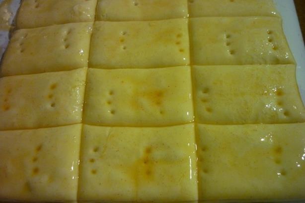 Пласт теста, предварительно размороженного, наколоть и смазать желтком.
