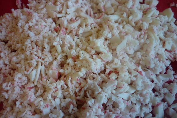 Крабовые палочки натереть на мелкой терке и отложить несколько ложек в сторону.