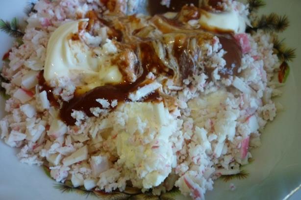 Творог смешать с основной массой крабовых палочек, добавить сметану и кетчуп, посолить, поперчить.
