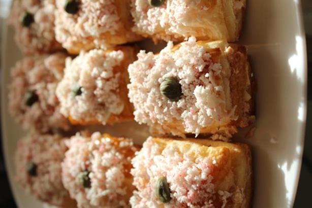 Готовые слойки разъединить на 3 части и промазать крабовой массой.