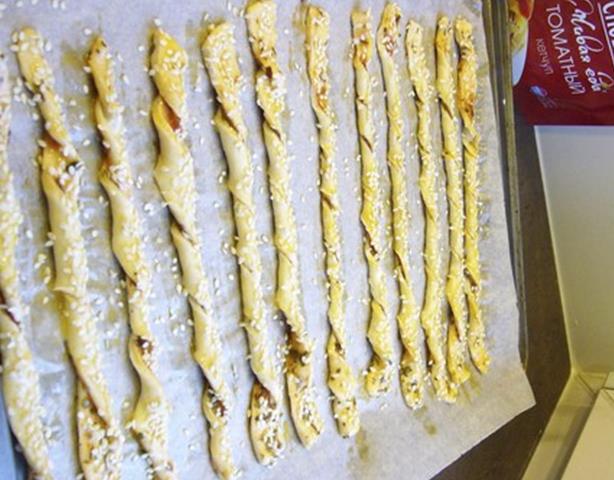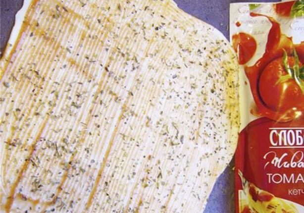 Раскатать тесто, смазать его кетчупом, посыпать прованскими травами и нарезать на полосочки.